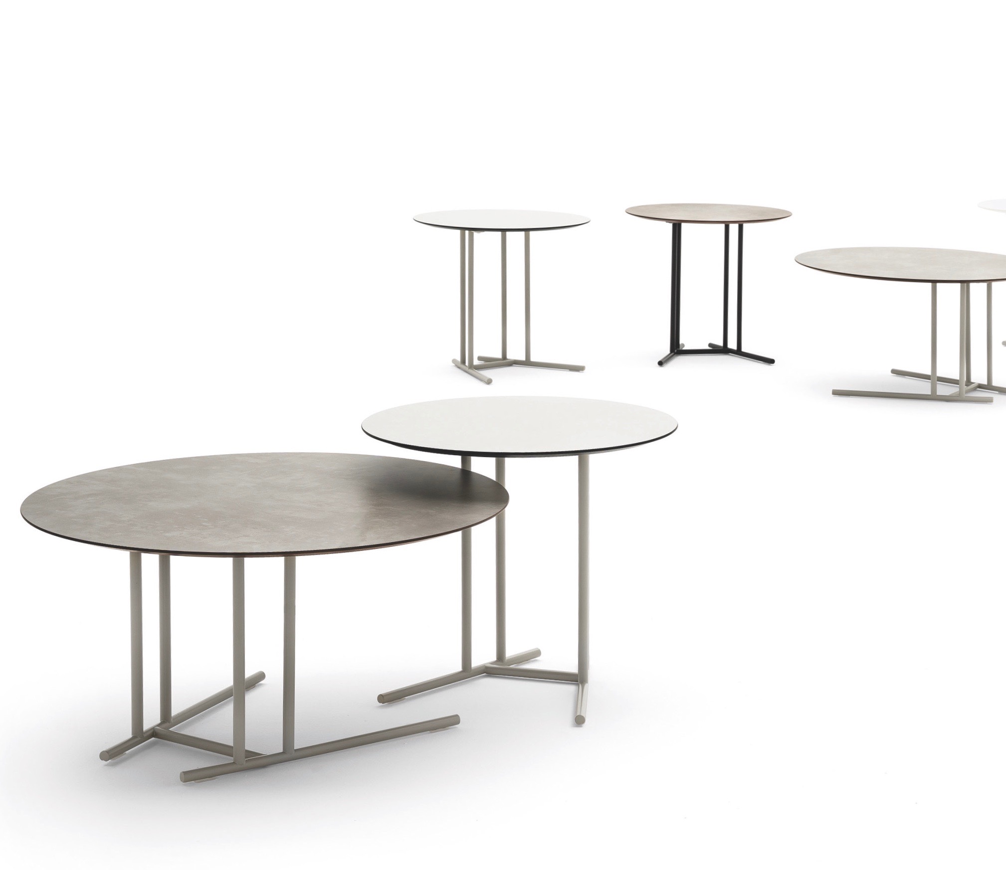 Bord med pulveralckerat underede i stål. bordsskiva i rektangulär eller elliptisk form i högtryckslaminat eller keramik.