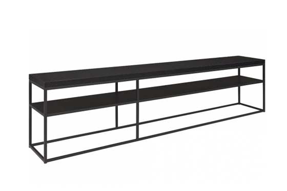Capulus, stilren mediabänk i svart trä med ben av metall.