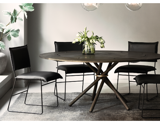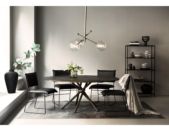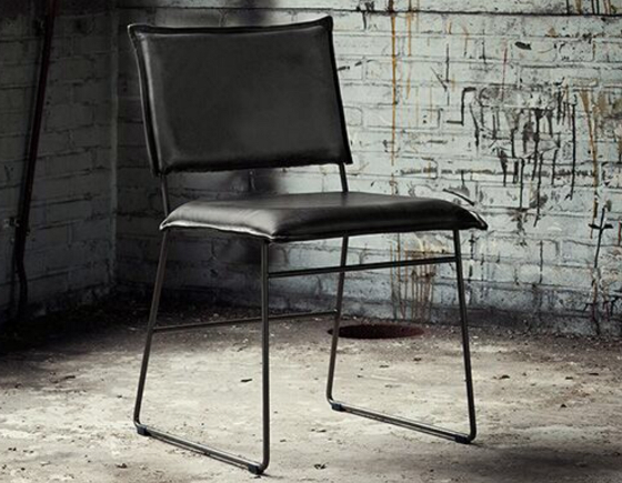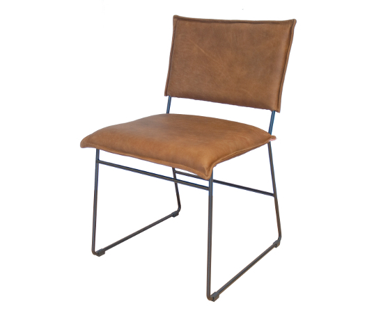 Matstol Norman i läder med metallben ”old glory”. Stoppad sits och rygg. Finns i flera färger och i tre läderkvaliteter; Bonanza som är ett tåligt oljat buffelskinn, Leer Luxor som är ett vaxat anilinläder vilket får vacker patina, samt Royal/Aurula.