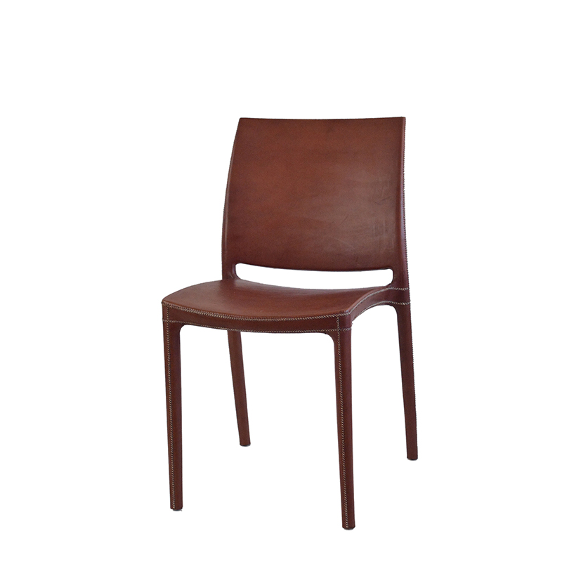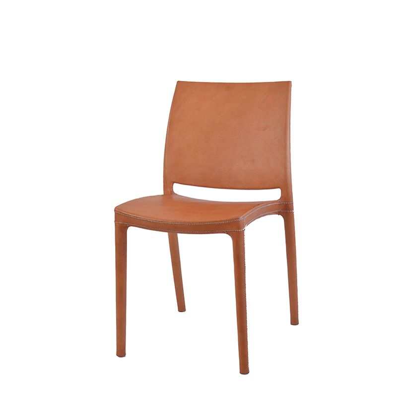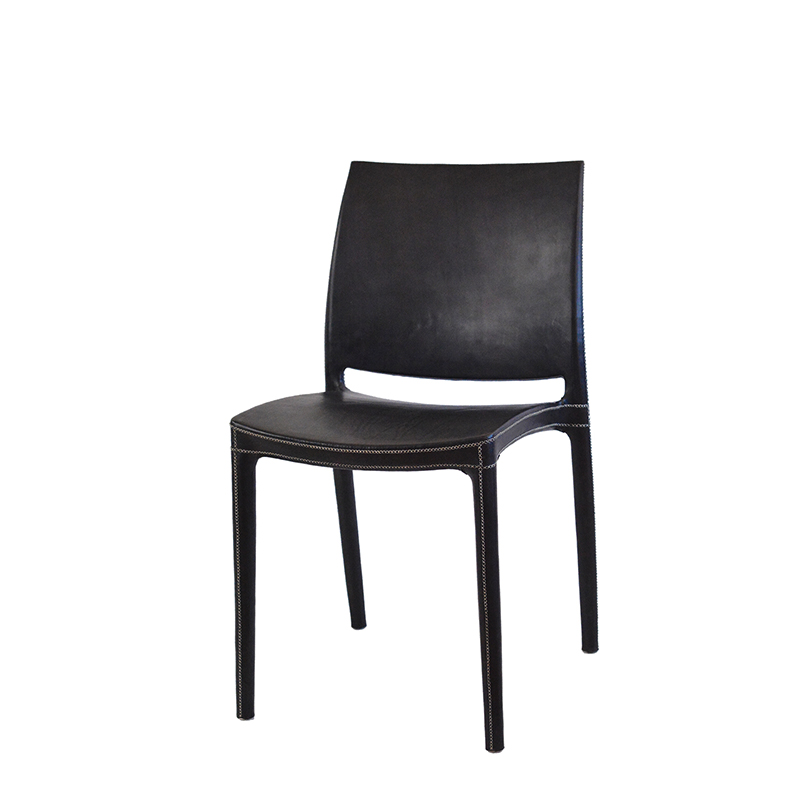 Matstol med sits i läder och underrede i stål. Finns i natur, mörkbrunt och svart läder.