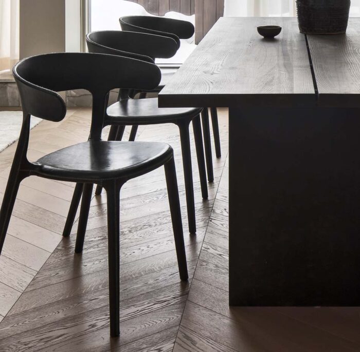 Sömnadsdetaljerna och det oljade lädret skapar en rustik kontrast till stolens slanka moderna siluett och återkopplar till hantverkets genuina ursprung.
