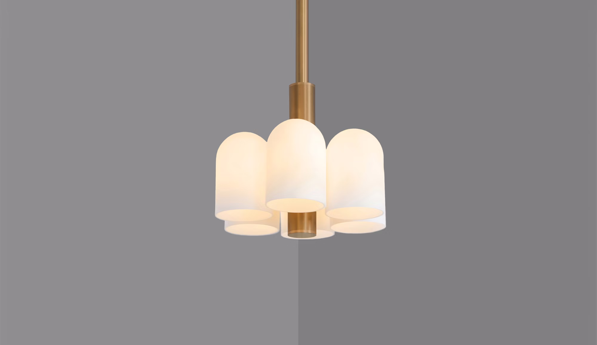 Denna futuristiskt inspirerade lampa kombinerar lekfullt design i både stor och småskalig form. Sex glaskupor bildar en struktur som påminner om ett bikakemönster – en form fylld av energi och rörelse. Konstruktionen vilar elegant kring en central stång i mässing, vilket ger lampan en harmonisk balans mellan dynamik och stabilitet.