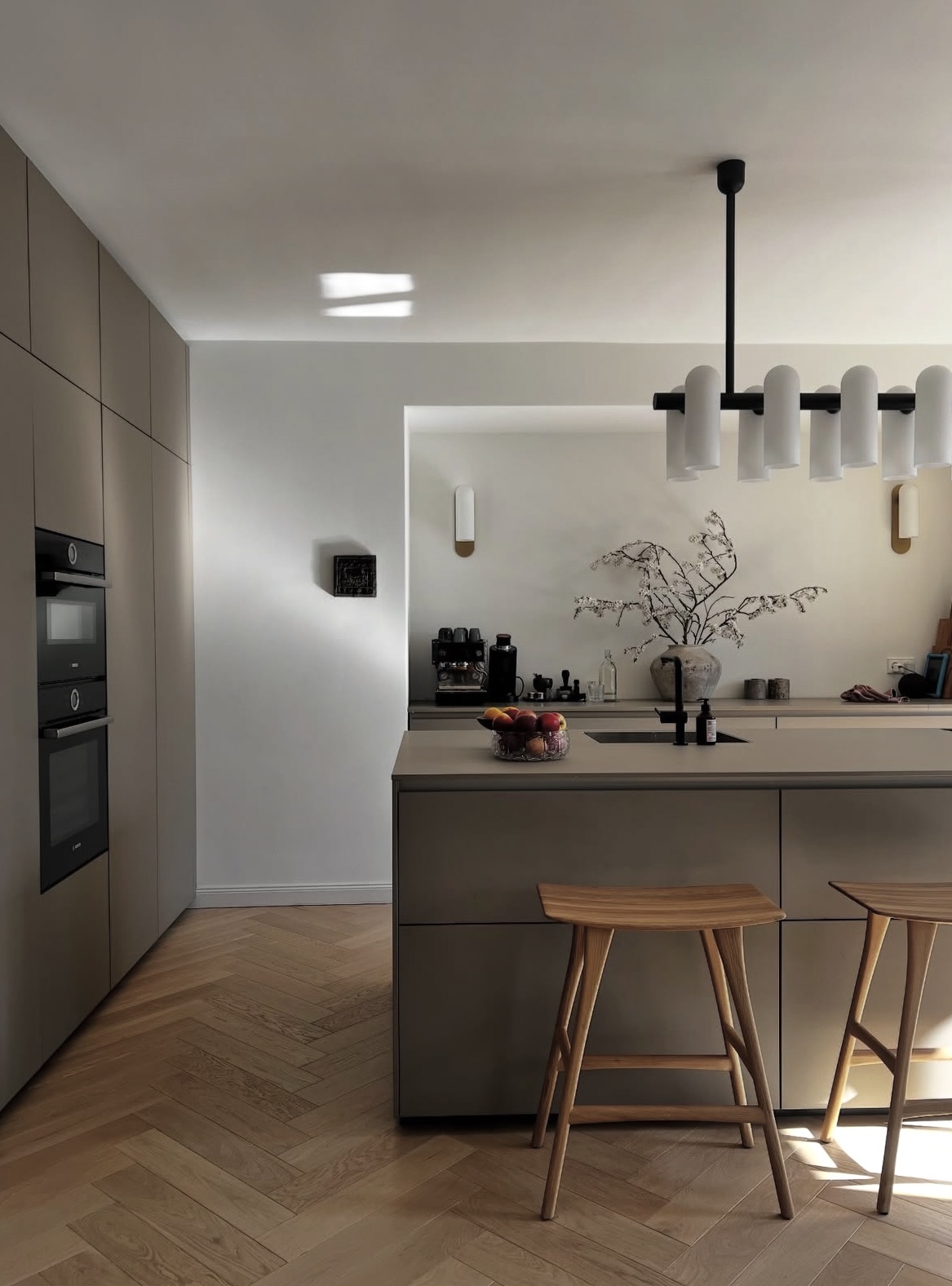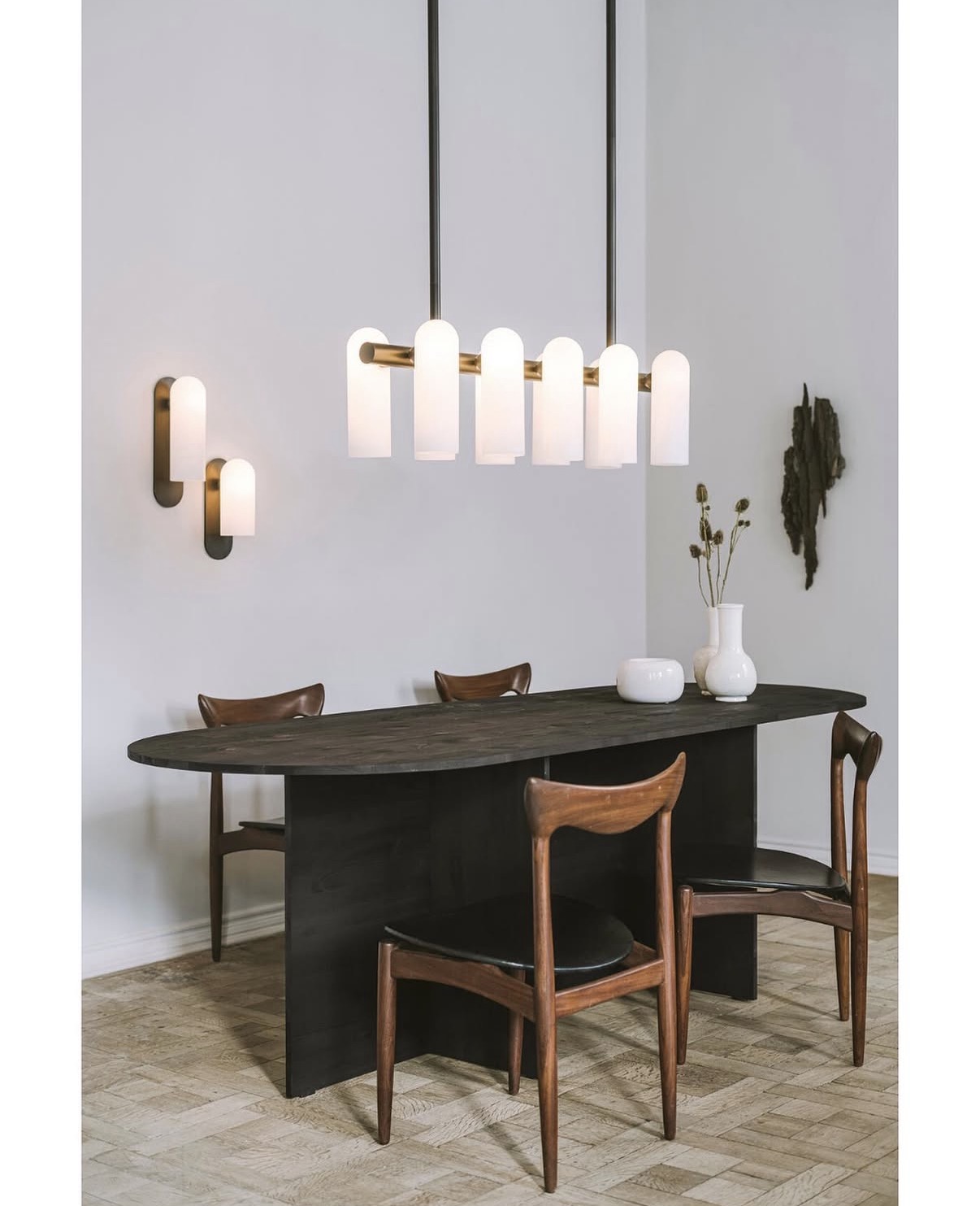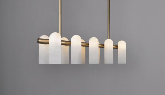 Denna eleganta lampa består av en kolonn av ljuskällor som tillsammans skapar ett mjukt och stämningsfullt sken. De frostade glaselementen sprider ett behagligt ljus, medan kontrasterande detaljer i mässing tillför balans och stabilitet till den harmoniska designen.