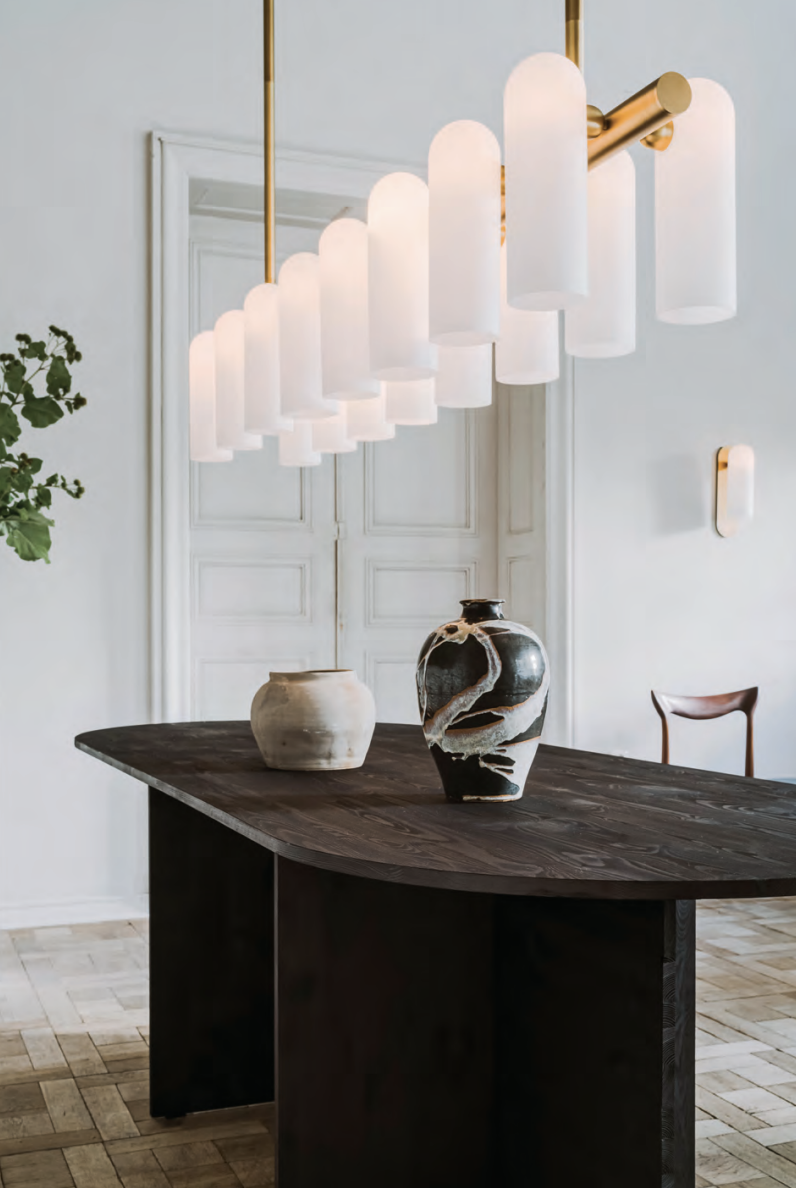 Lampan kan beställas i flera utföranden där både glaselement och metallstomme finns i olika färger, vilket gör det möjligt att skapa en personlig kombination – exempelvis i mässing, brons, svart eller nickel – som harmonierar med olika typer av inredningar. Den höga materialkvaliteten och den skulpturala designen ger lampan ett exklusivt och sofistikerat uttryck som passar perfekt i både privata och offentliga miljöer.